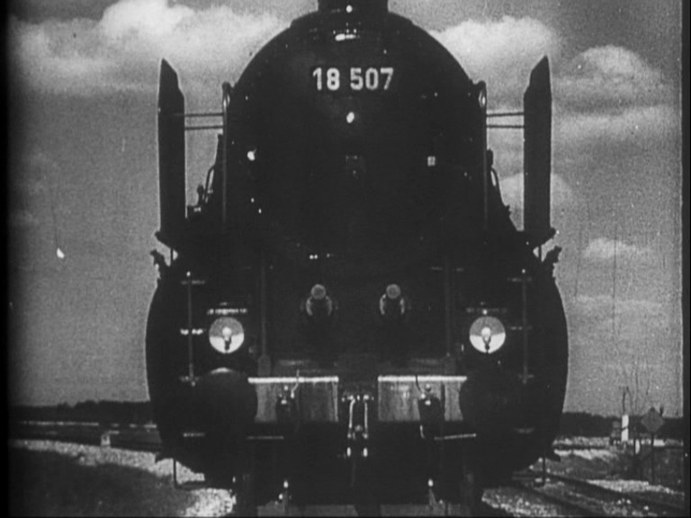 Manches an PACIFIC 231 erinnert frappant an DAS STAHLTIER. Natürlich drängen sich bei solchen Filmen manche Bildideen auf, etwa, die Kamera unter einem der vorderen Puffer der Lok zu befestigen und sie so knapp über den Schienen hinweggleiten zu lassen, oder die Kamera zwischen oder knapp neben den Schienen einzugraben und den Zug darüber hinwegbrausen zu lassen. Dennoch frage ich mich, ob Mitry DAS STAHLTIER gekannt haben könnte, bevor er PACIFIC 231 drehte. Ausgeschlossen ist das nicht. Zielke wies Anfang der 50er Jahre darauf hin, dass eine Kopie von DAS STAHLTIER 1945 von französischem Militär bei Leni Riefenstahl in Kitzbühel beschlagnahmt und nach Paris gebracht worden sei (eine andere Kopie soll laut Zielke nach Russland gebracht worden sein). Das ist durchaus plausibel. Riefenstahl besaß in Kitzbühel ein Haus, das auch als Zweigstelle ihrer Riefenstahl Film GmbH diente. Es gab dort Räume mit Ausrüstung für Filmschnitt, -vertonung und -vorführung. Riefenstahl arbeitete dort 1945 an der Endfertigung von TIEFLAND, fernab vom Bombenhagel in Berlin (sie wurde aber bis Kriegsende nicht fertig, weshalb dieser Film erst 1954 herauskam). Im Sommer 1945 wurde das Anwesen mitsamt dem darin befindlichen Filmmaterial von der französischen Besatzungsmacht beschlagnahmt, Riefenstahl nach Deutschland ausgewiesen und die Filme 1946 nach Paris gebracht. Um 1953 wurde DAS STAHLTIER in der Cinémathèque Française aufgefunden, offenbar das bei Riefenstahl sichergestellte Exemplar. Jean Mitry wiederum war neben Henri Langlois und Georges Franju einer der Gründer der Cinémathèque. Er kannte sich dort also aus und könnte irgendwann zwischen 1946 und 1949 DAS STAHLTIER zu Gesicht bekommen haben. Belege dafür sind mir aber nicht bekannt. Neben PACIFIC 231 sind noch SNOW (1963), RAIL (1966) und LOCOMOTION (1975) erwähnenswert, die Geoffrey Jones für British Transport Films, die damalige Filmabteilung der britischen Eisenbahn, gedreht hat, und die ebenfalls sehr dynamisch und nach musikalischen Prinzipien geschnittene Eisenbahnaufnahmen zeigen. LOCOMOTION ist auch wie DAS STAHLTIER ein Jubiläumsfilm, entstanden zum 150. Jahrestag der Stockton and Darlington Railway, mit der 1825 die Passagierbeförderung per Eisenbahn begann.