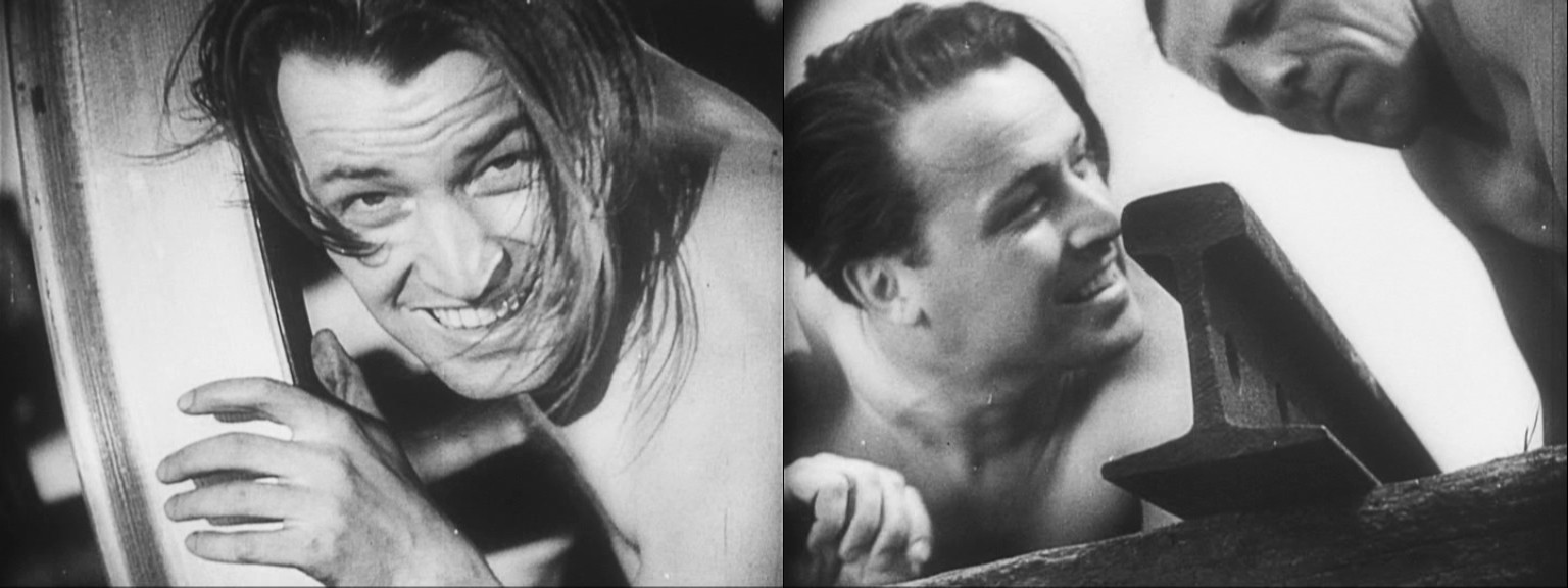 Aber der überwiegende Teil der Rahmenhandlung läuft ganz unspektakulär ab. Es werden alltägliche Aufgaben verrichtet, aber es wird auch ausgiebig Pause gemacht. Die Arbeiter sind keine arischen Helden der Arbeit, sondern Alltagstypen, die meisten nicht mehr ganz jung, mit Durchschnittsgesichtern, der eine ein dürrer Spargeltarzan, der nächste mit Zahnlücken, ein anderer mit Blumenkohlnase. Das Faulenzen, Brotzeitmachen und Herumjuxen an einem Teich wird von Zielke im Geist der Neuen Sachlichkeit dargestellt - Martin Loiperdinger, der einen lesenswerten Text über DAS STAHLTIER geschrieben hat (Quellen siehe Ende des zweiten Teils), vergleicht diese Szenen mit MENSCHEN AM SONNTAG (1930), wo man sich am Wannsee dem Nichtstun hingibt. Der "nationalsozialistische Geist", den Albert Gollwitzer in jedem Winkel der Reichsbahn walten lassen wollte, ist hierhin noch nicht vorgedrungen, und gerade deshalb vermitteln diese Szenen wohl einen realistischen Eindruck vom Alltag der Arbeiter. Überhaupt gibt es im ganzen Film außer einem "Heil Hitler!", als Claaßen zum erstenmal die Arbeiter begrüßt, keine Symbole des Nationalsozialismus zu sehen oder zu hören. Nun, einen kleinen "Ausrutscher" leistet sich Zielke aber doch: In einer Szene, in der Schienen verlegt werden, ist Claaßen mit nacktem Oberkörper und in heroisierender Untersicht gefilmt zu sehen - hier ist er plötzlich doch, der "arische Typus", wie er auch aus einem Film von Leni Riefenstahl stammen könnte, wenn auch nur für einige Sekunden. DAS STAHLTIER lässt sich nicht auf einen einfachen Nenner bringen.